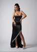 Long black satin dress with silver rhinestones