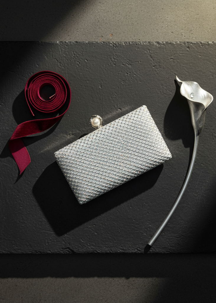 Clutch-ul Crystal Pearl este realizat dintr-o textură strălucitoare acoperită cu cristale fine, iar detaliul luxos al închizătorii cu perlă îl transformă într-o piesă unică.