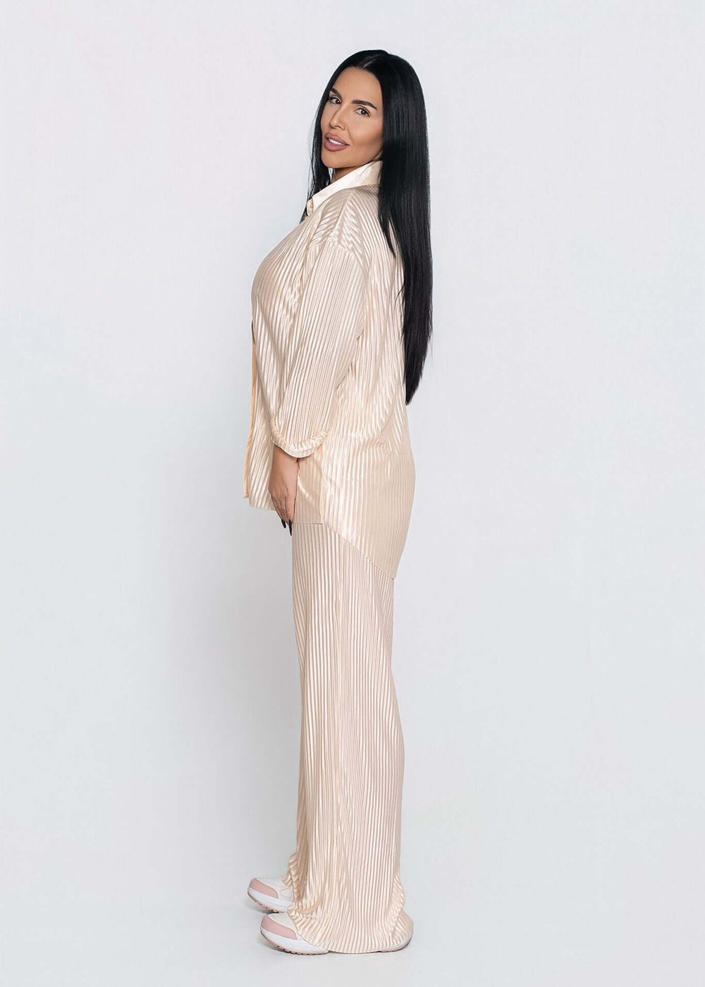 Realizat din material satinat plisat, cu efect lucios și fluid, setul este compus dintr-o cămașă oversize cu nasturi și mâneci lungi, alături de pantaloni wide leg cu croi lejer și talie elastică. Designul său permite purtarea pieselor atât împreună, cât și separat, oferind multiple posibilități de styling – de la casual-chic la office sau seară. SIA Allure este alegerea ideală pentru femeile care își doresc rafinament, libertate de mișcare și un look actual.