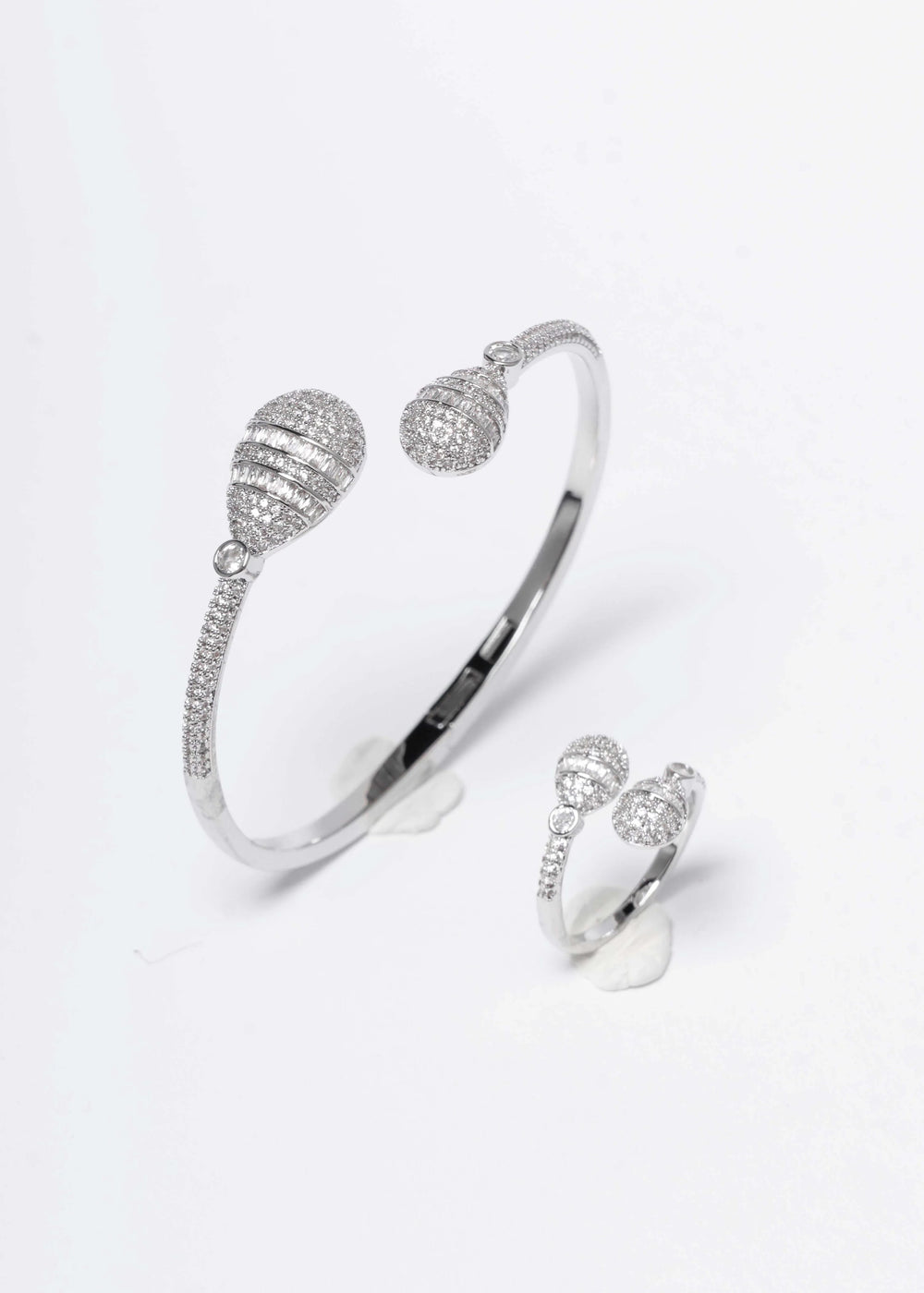 Transform any gesture into a moment of absolute elegance with the Galaxy Drop set – a rigid bracelet and matching ring, with rounded ends, inspired by the shape of a drop paved with crystals. It combines luxury with delicacy and highlights the wrist in a spectacular way.