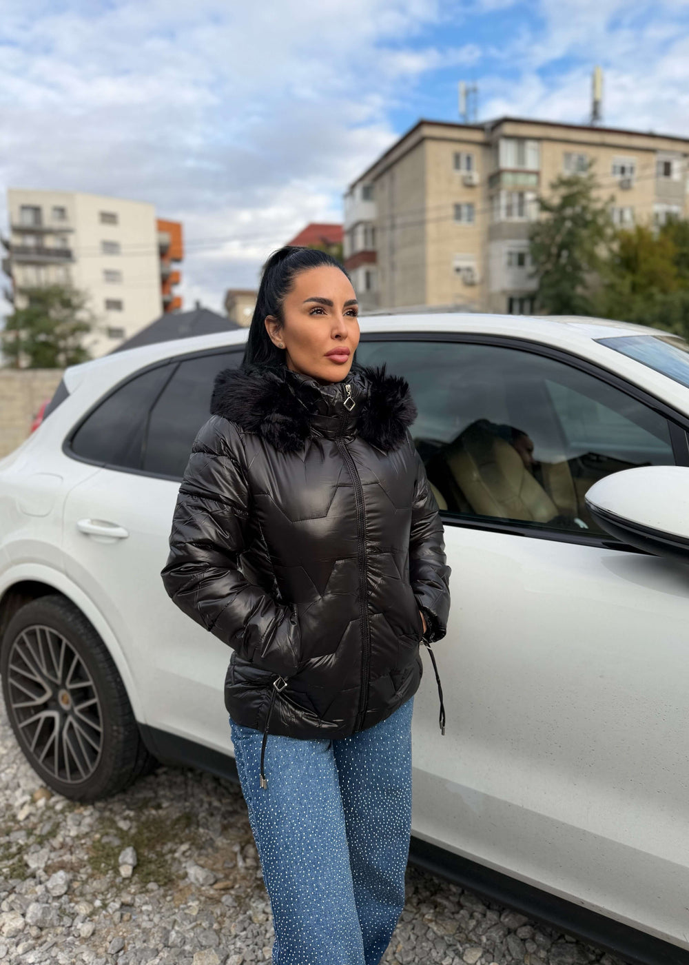 Poartă-i cu un body negru și geaca SIA Winter Armor pentru un look glam urban, sau cu un top elegant și tocuri pentru o apariție de seară sofisticată.