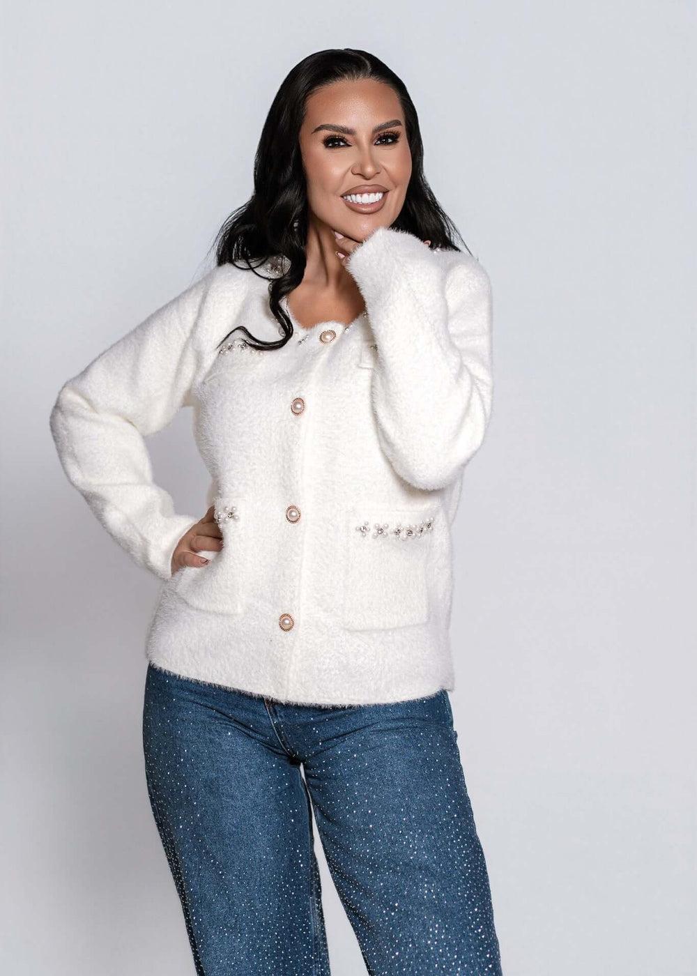 Ridică-ți ținutele de zi la nivel de eleganță effortless cu SIA Pearl Glow Cardigan — o piesă ce îmbină confortul moale cu detalii bijuterie spectaculoase.