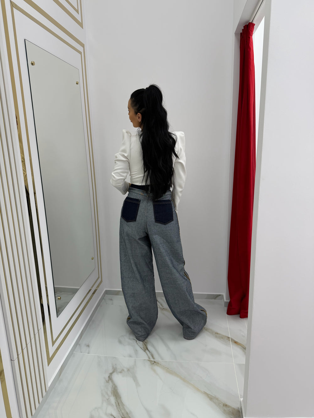 Realizați din denim moale, cu o croială lejeră și un design unic „inside-out”, acești jeans transformă casualul în fashion statement. Detaliile contrastante, cusăturile vizibile și buzunarele din denim închis adaugă un plus de originalitate, făcându-i piesa perfectă pentru femeile care vor să iasă din tipare.